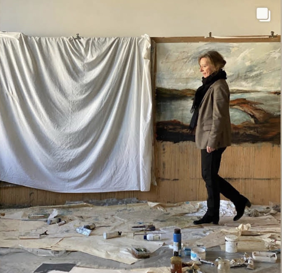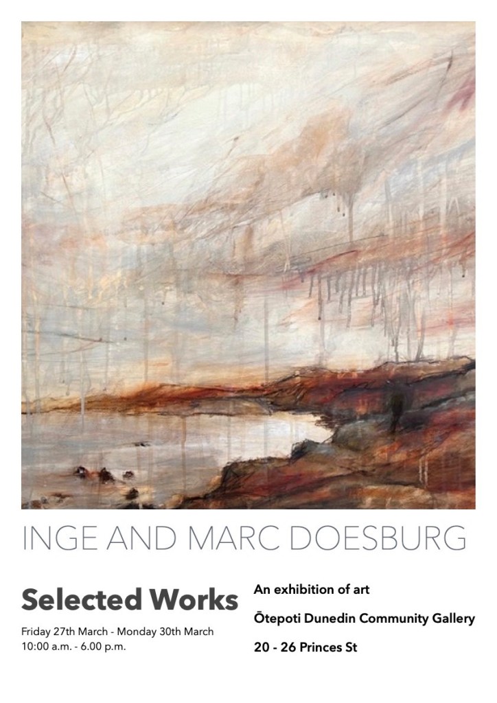 David Eggleton, New Zealand’s Poet Laureate 2019-2021, describes Inge’s art in the following terms: ‘Doesburg delivers images of the land that look as if they’ve been scratched on pitted rock, then given patinas of orange lichen and silvery muttonbird fat. Tree bark, eel skin and fish skin spring to mind as you gaze at her print textures. . . . [T]he wild weather she depicts harks back to 19th century German Romantic landscapes. Sploshes of white or grey-blue are left to drip and animate surfaces, evoking fast-travelling fog, mist and cloud that dapples and darkens the light. In the end all is atmosphere: squalls process across louring bluffs and headlands and hill crowns in a lashing, ecstatic frenzy.’